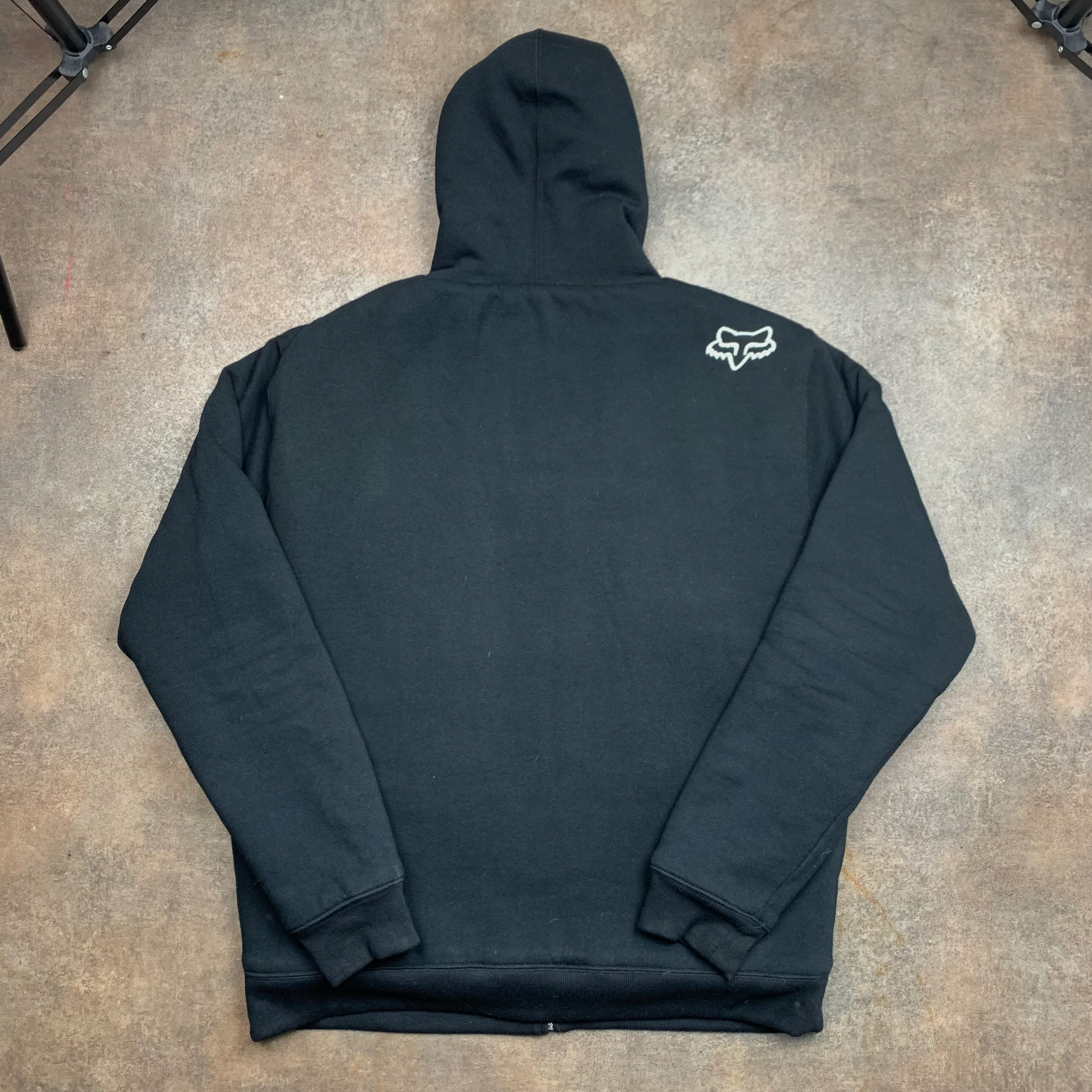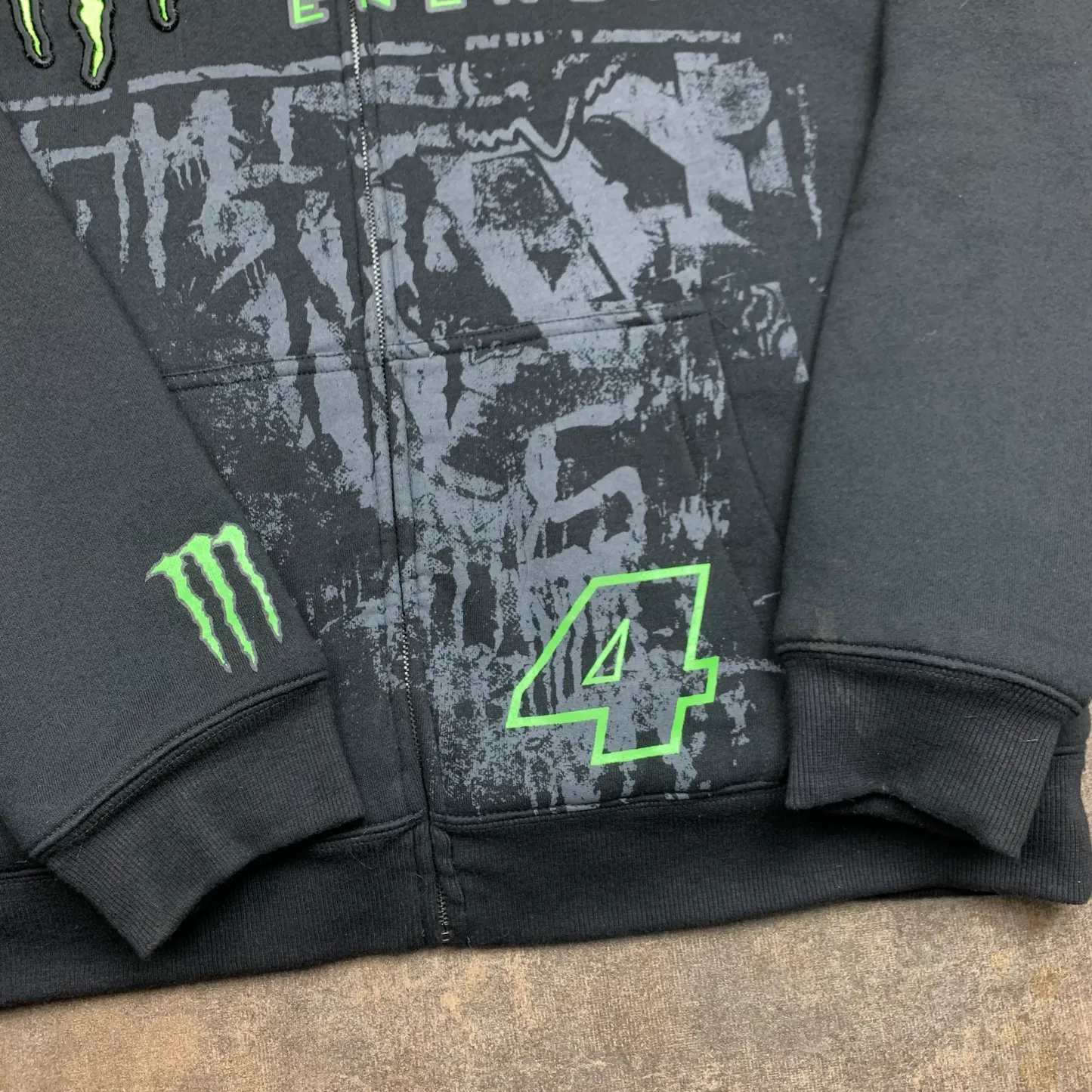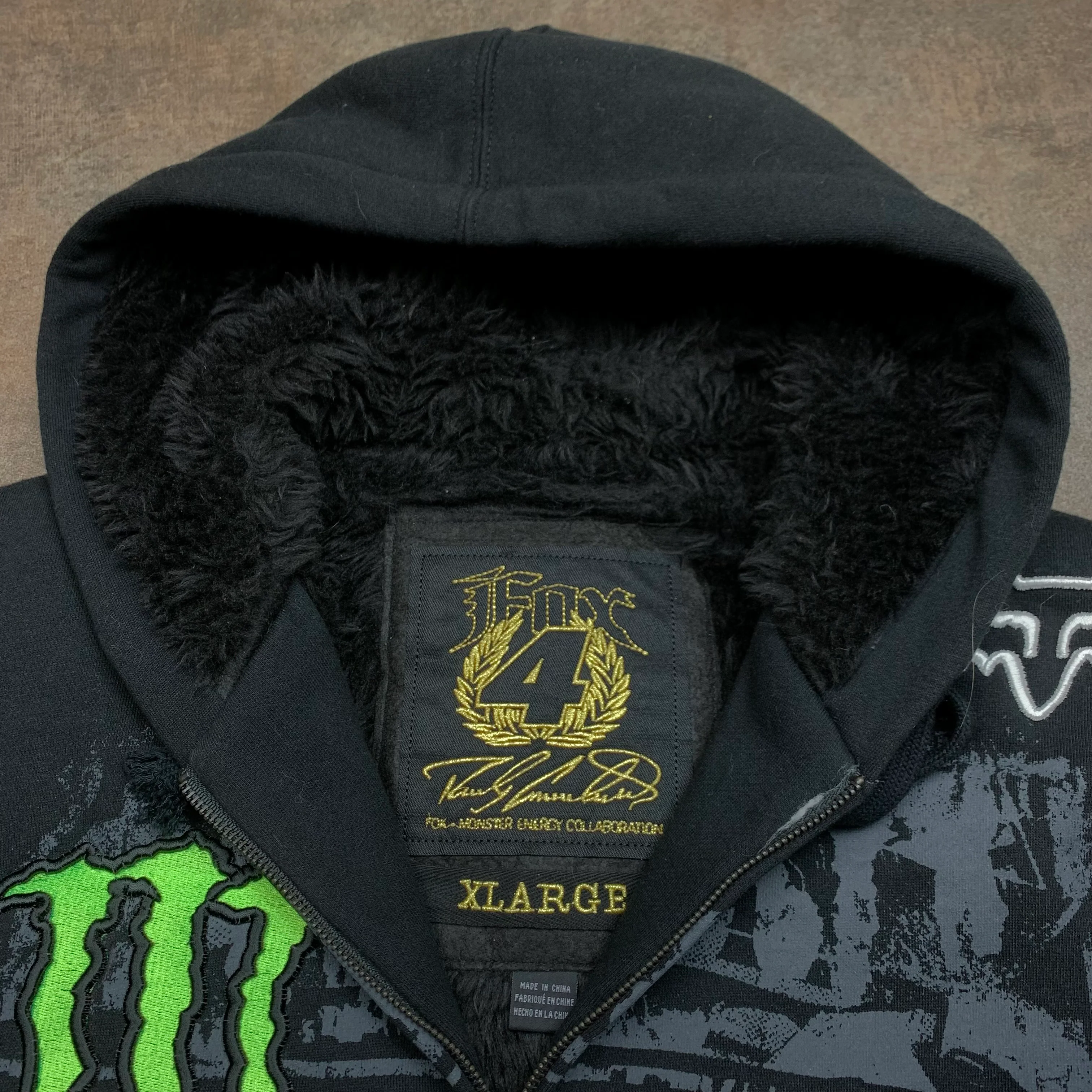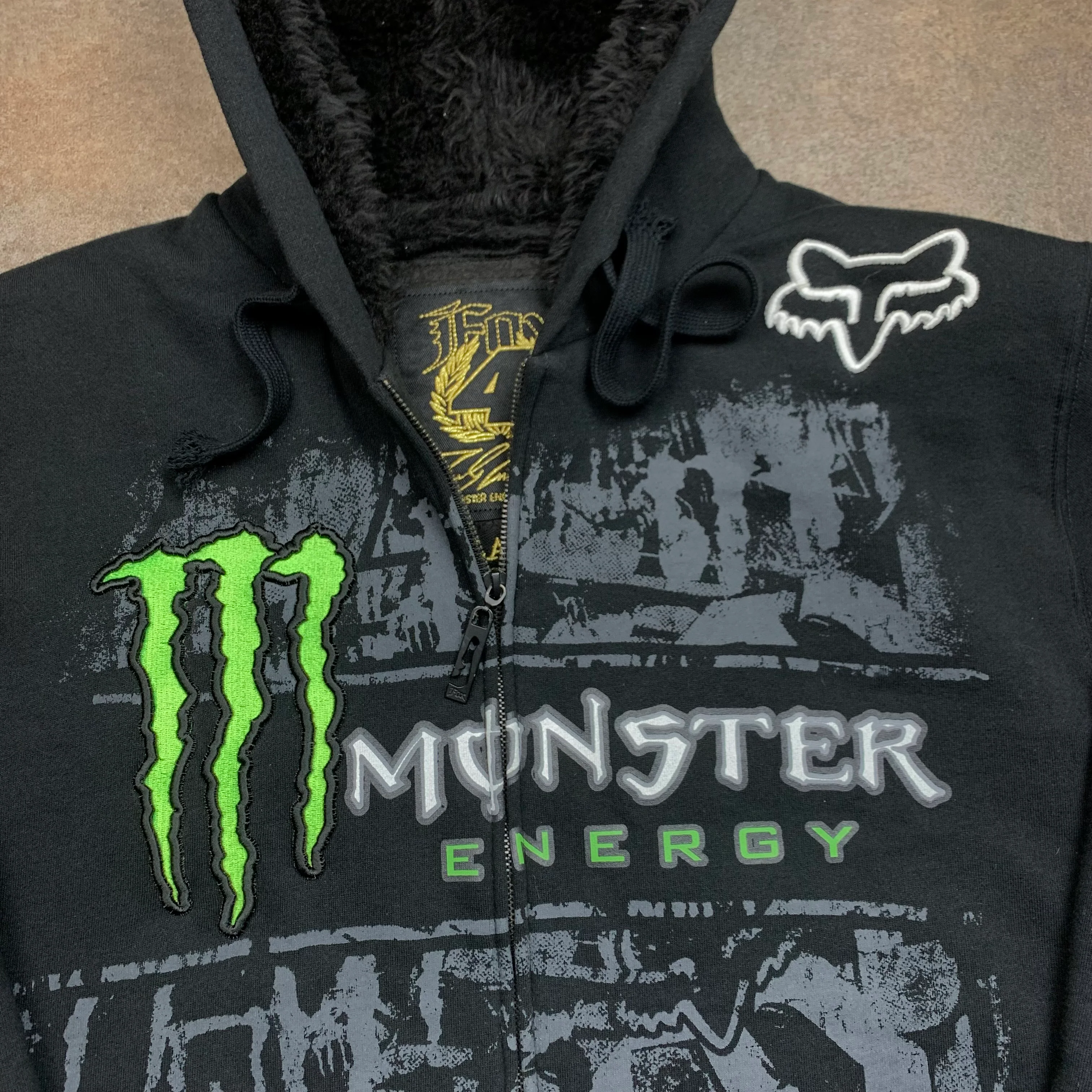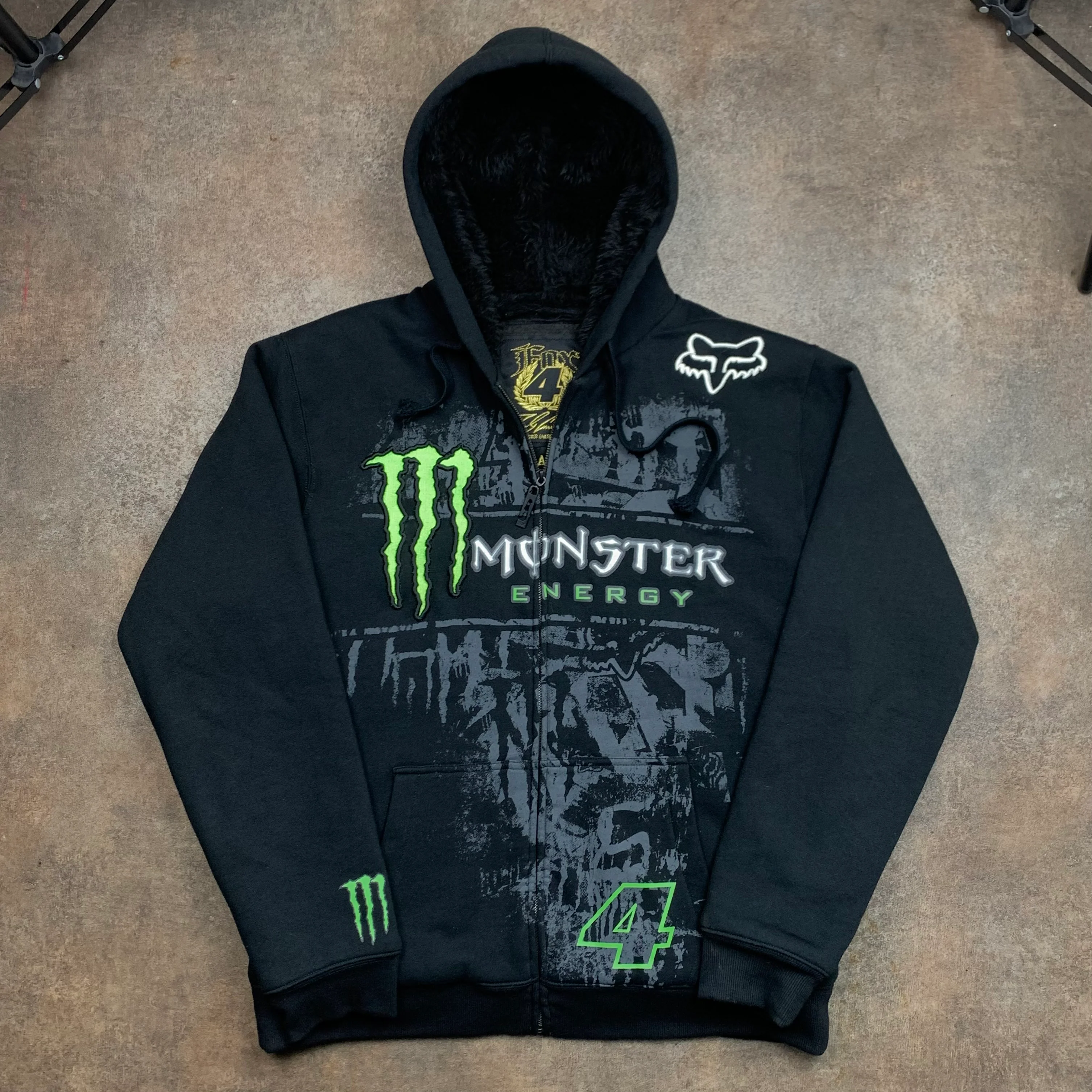 Rare Fox Racing sasquatch hoodie in collaboration with Monster / Ricky Carmichael with embroidered fox head logos back & front, an embroidered monster logo on the front, printed graphics on the sleeve, pocket & front, coloured black all over, thick fur lining inside / quilted sleeves