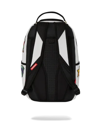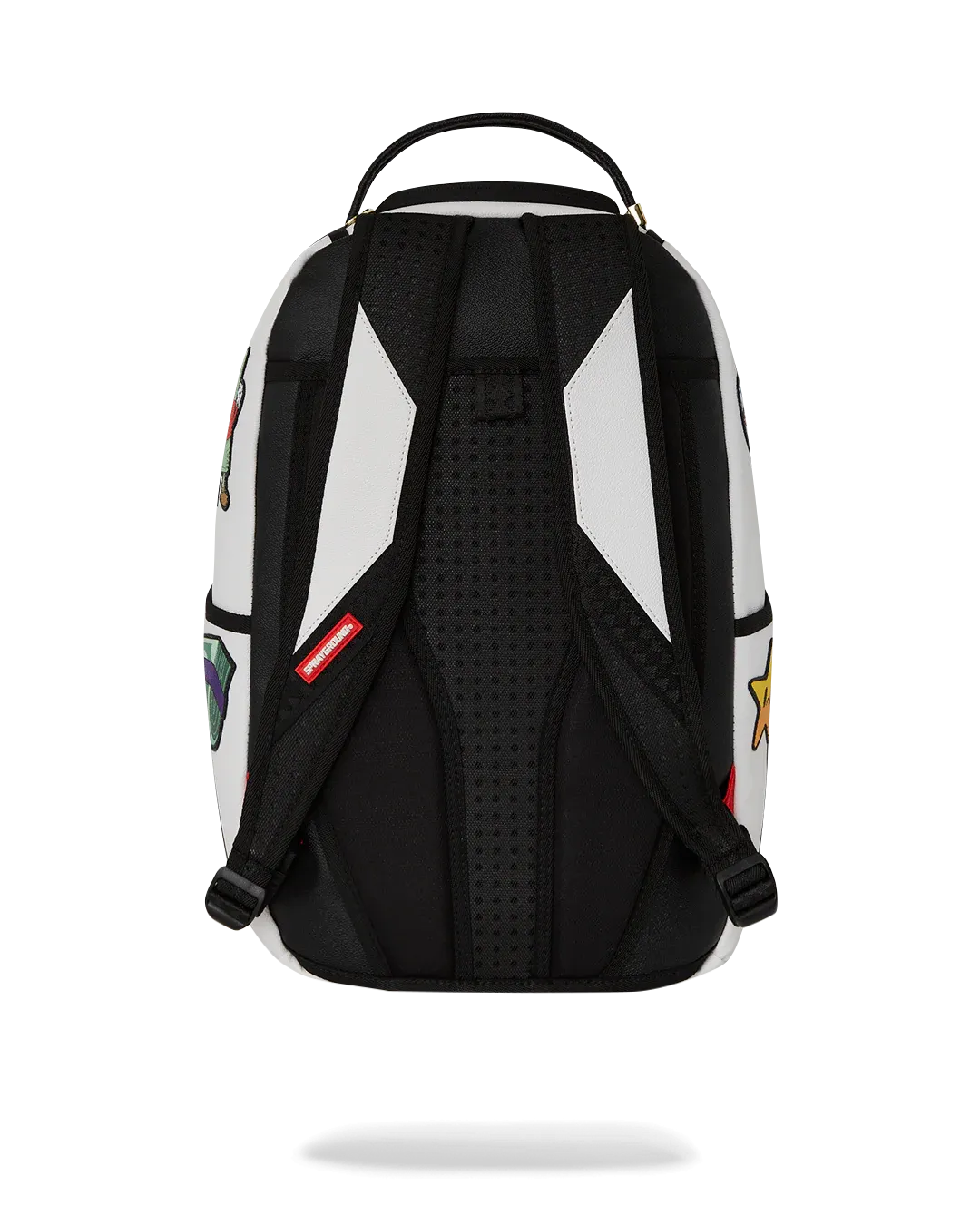 Dimensions: 18" x 6" x 11.5" • Front zipper pocket • Side pockets • Zippered Stash pocket • Separate velour sunglass compartment • Ergonomic mesh back padding • Adjustable Straps for custom sizing • Gold zippers with metal hardware • Metal "Sprayground Authentic" badge • Slide through back sleeve connects to carry-on luggage to free your hands